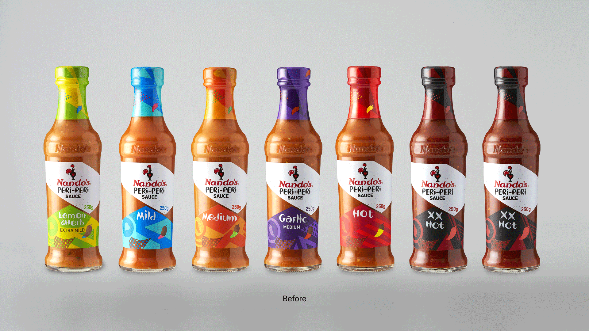 We eliminated shopper confusion by developing a clear messaging hierarchy. Amplifying Nando’s Hand, a distinct brand asset, helped us own PERi-PERi; adapting other assets led to greater comprehension around heat levels and more. We also designed a provenance icon, addressing both ingredient credentials and the brand’s origin story. Now, with a new PERi-PERi pattern and bold use of colour, the packs shout from the shelf – balancing category-fit functionality with Nando’s youthful, African energy.